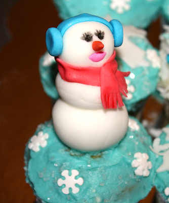 I baked up coconut cupcakes with vanilla butter cream frosting and used fondant to make the little snowmen, snow'lady', and snowflakes then sprinkled coconut flakes on top and around the cupcakes on the tray. They were a huge hit at Serina's birthday party!